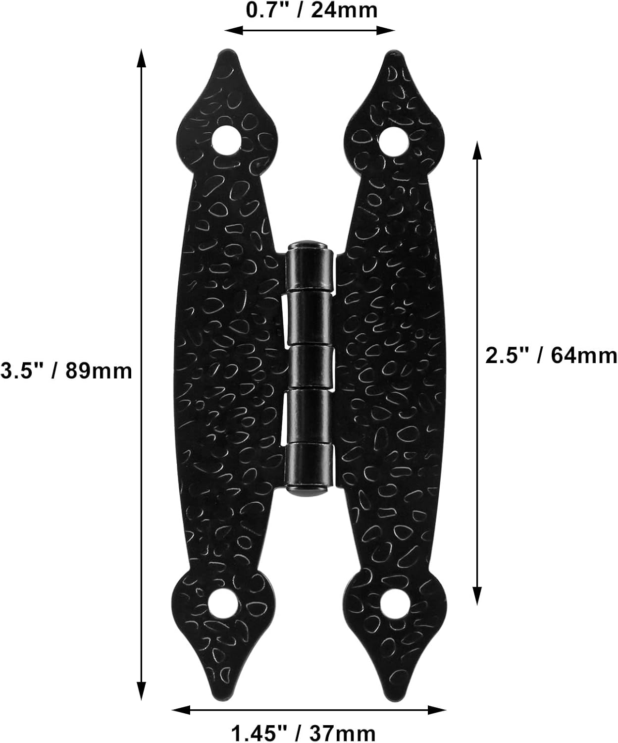 Introducing our 4 Pack of 3.5 Inch Black Antique H Hinges, perfect for adding a touch of vintage charm to your cabinets, drawers, jewelry boxes, and more. These hinges are made from high-quality cold rolled steel, ensuring durability and longevity.